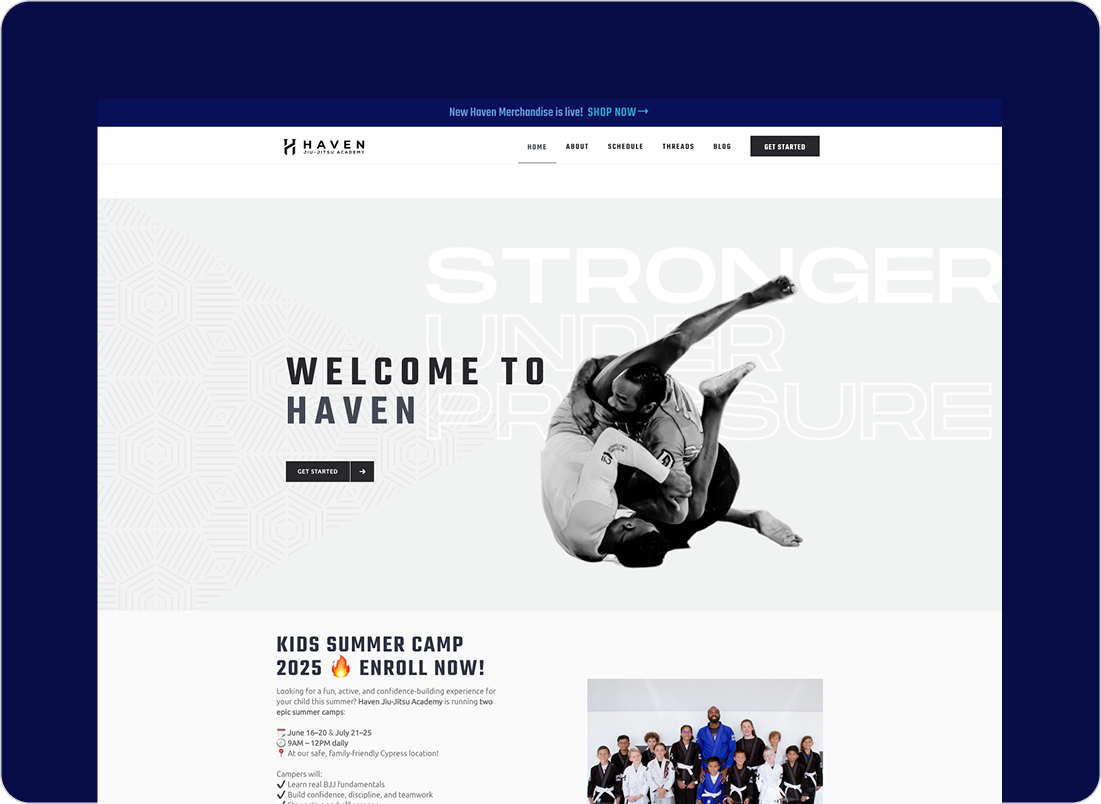 As a brand-new jiu-jitsu academy, Haven needed more than just a website — they needed a compelling digital presence to tell their story, attract new students, and manage growth. Their goals were: